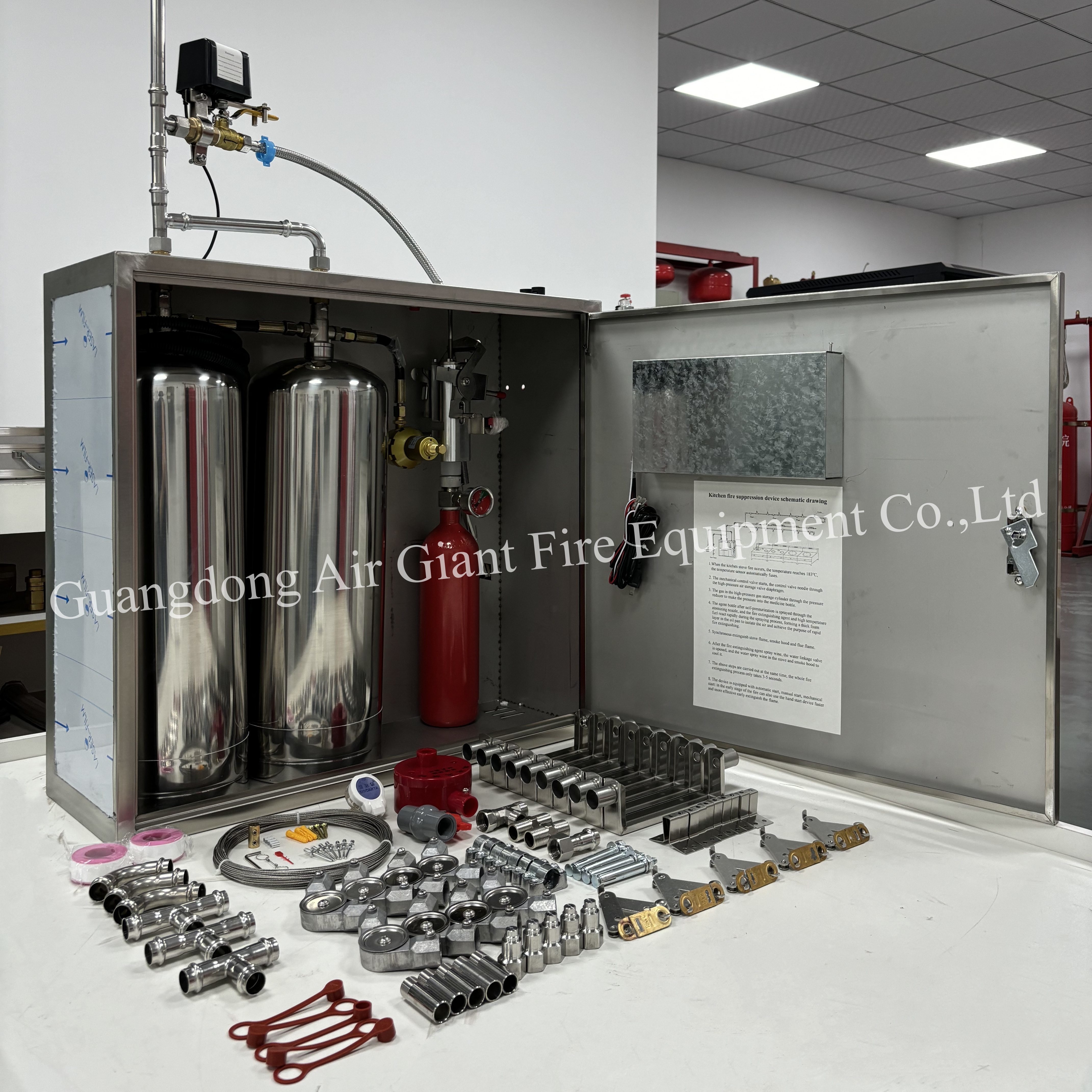 อุปกรณ์ดับเพลิงเครื่องครัวชุดอุปกรณ์ครบถ้วนที่ติดตั้งในสภาพแวดล้อมความชื้นและความร้อนสูง เช่น ห้องครัวอุตสาหกรรม ห้องครัวพาณิชย์ และห้องครัวพลเรือน ซึ่งรวมถึง: