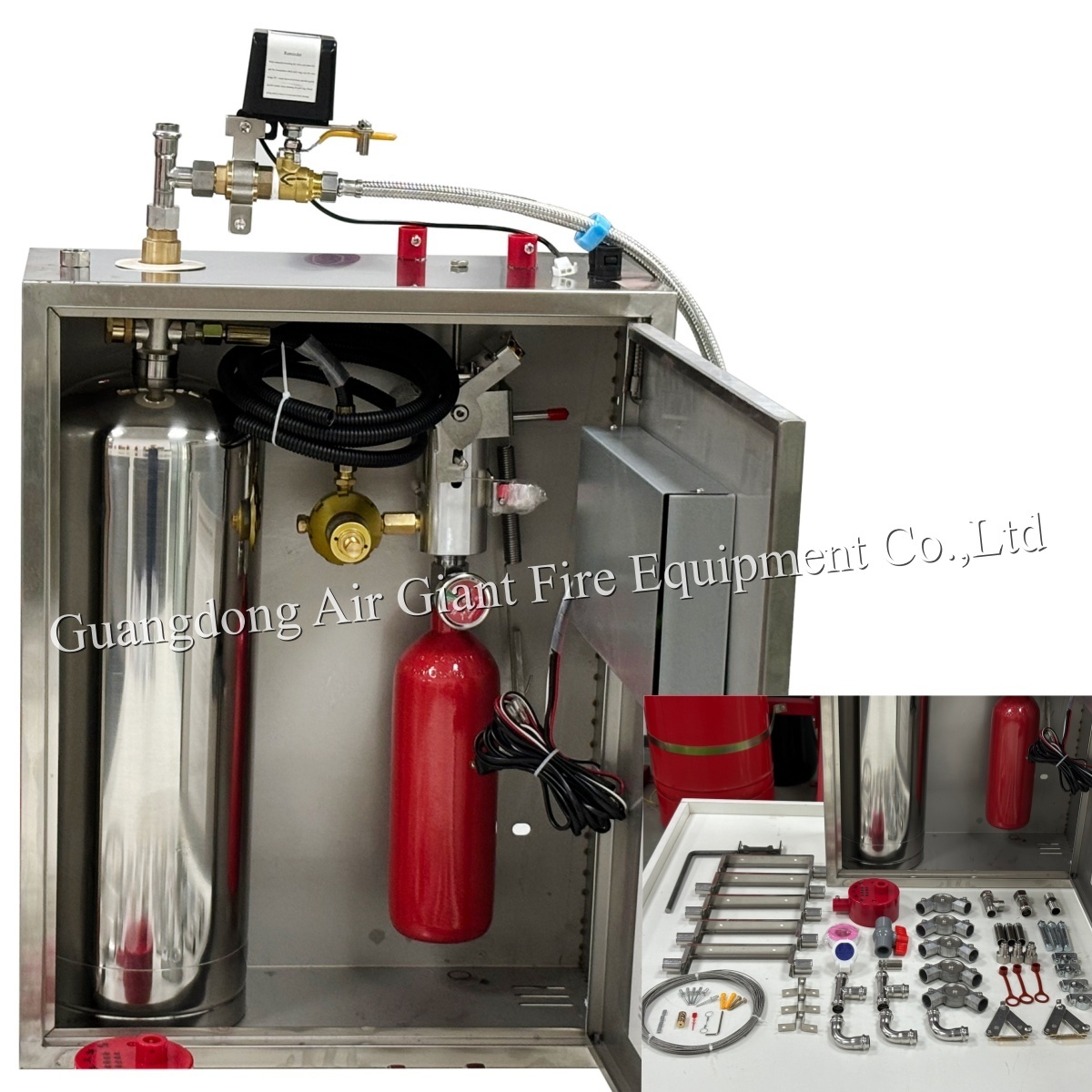 2ประเภทของสารดับเพลิง: ระบบดับเพลิงครัวบางส่วนใช้ก๊าซแรงดันสูงในการขับเคลื่อนสารดับเพลิง ในกรณีนี้เครื่องขับเคลื่อนกลไกเจาะกล่องแก๊สแรงดันสูง, ปล่อยก๊าซความดันสูงเข้าไปในแวลล์ลดความดัน ก๊าซจะเข้าไปในด้านบนของกระบอกยาดับไฟการผลักดันตัวแทนผ่านท่อส่งไปยังช่องฉีด.